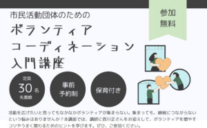 活動を広げたいと思ってもなかなかボランティアが集まらない 集まっても継続につながらないという悩みはありませんか? 講師に西川正さんをお迎えてしてボランティアを増やすコツやうまく関わるためのヒントを学びます (こんなお悩み […]